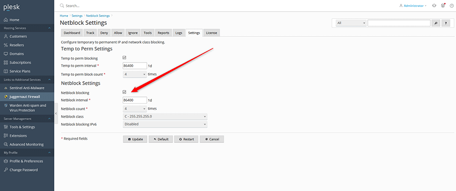 1. Navigate to Juggernaut Firewall -> Settings -> Login Failure Daemon -> Netblock Settings.