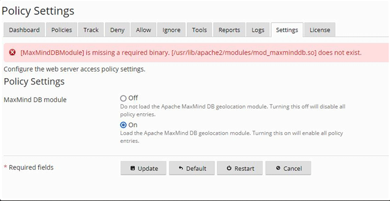 How can I fix the error: MaxMindDBModule is missing a required binary when trying to enable the MaxMind DB module?